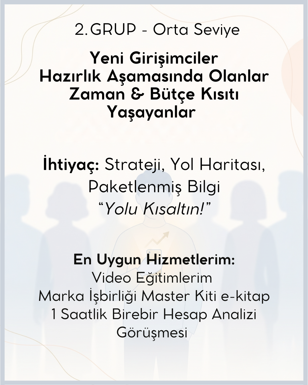Biliyorum ki her girişimcinin mizacı ve yoğurt yiyişi farklıdır. Bu yüzden kopyala-yapıştır taktikler yerine; sizin karakterinize en uygun yolu birlikte netleştiriyoruz. Hedefim; sürecin sonunda neyi, neden yaptığını bilen ve kendi sistemini özgürce yönetebilen güçlü bir marka liderine dönüşmeniz."