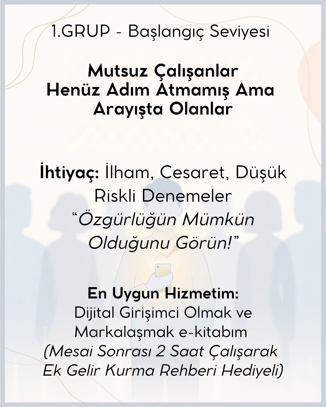 Kesinlikle. Özellikle "Arayışta Olanlar" segmentimiz tam olarak sizin gibi; mevcut işinden mutsuz olan ancak nereden başlayacağını bilemeyenler için tasarlandı. "Dijital Girişimci Olmak ve Markalaşmak" e-kitabımız, risk almadan, mevcut düzeninizi korurken ilk adımı atmanızı sağlar. Ayrıca yanında hediye ettiğimiz "Mesai Sonrası 2 Saat Çalışarak Ek Gelir Kurma Rehberi" ile zaman yönetimi konusunda pratik bir yol haritası sunuyoruz.